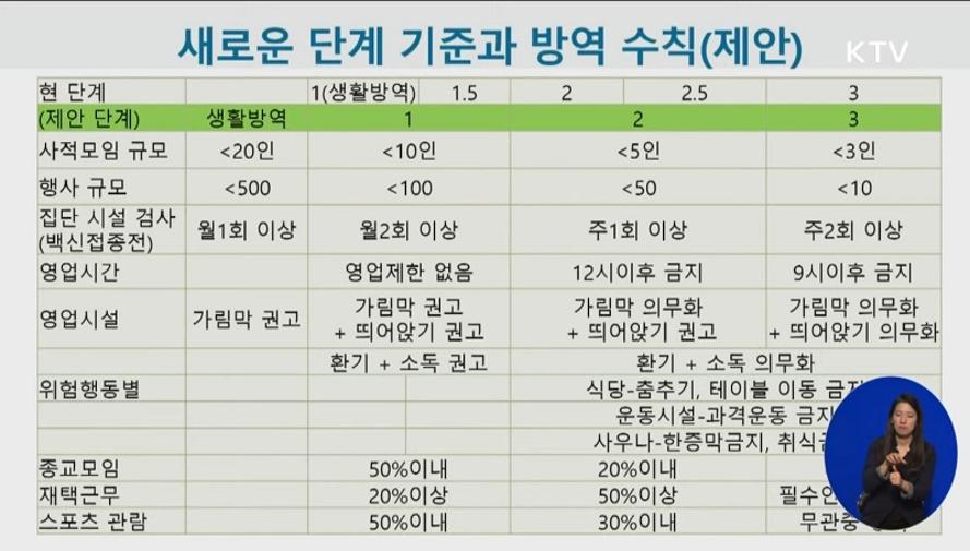 정부가 '사회적 거리두기' 단계를 현행 5단계에서 4단계로 간소화하고, 집합금지를 최소화하는 방향의 거리두기 개편안 초안을 5일 공개했다. 거리두기 개편안 4단계로…자영업자 피해 최소화. 10만 명 당 1.5명 (전국 778명) 이상, 중환자실. 2단계부터 9명, 5명, 오후 6시 이후 3명 모임금지. 인구 10만명당 주간 평균 환자 수, 병상 등 조정 기준.